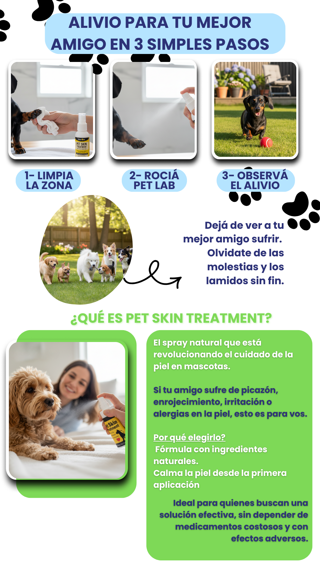 Aplicá Pet Skin Treatment 1 a 2 veces por día sobre la zona afectada, durante 5 a 10 días según la gravedad. No necesita enjuague y es seguro si tu mascota se lame. Ideal para aliviar irritaciones, hongos, picazón o enrojecimiento.